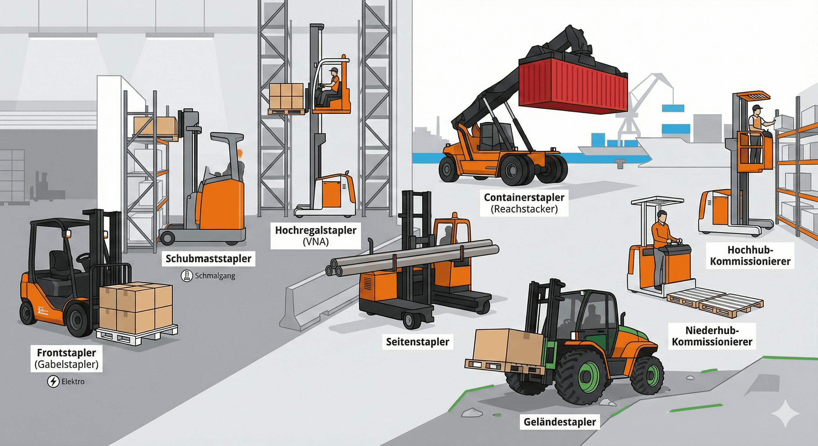- Containerstapler (Reachstacker): Schwere Flurförderzeuge, die für den Umschlag von ISO-Containern in Häfen oder Bahnhöfen eingesetzt werden. Sie verfügen über Teleskopausleger und sogenannte Spreader zur Verriegelung der Container.