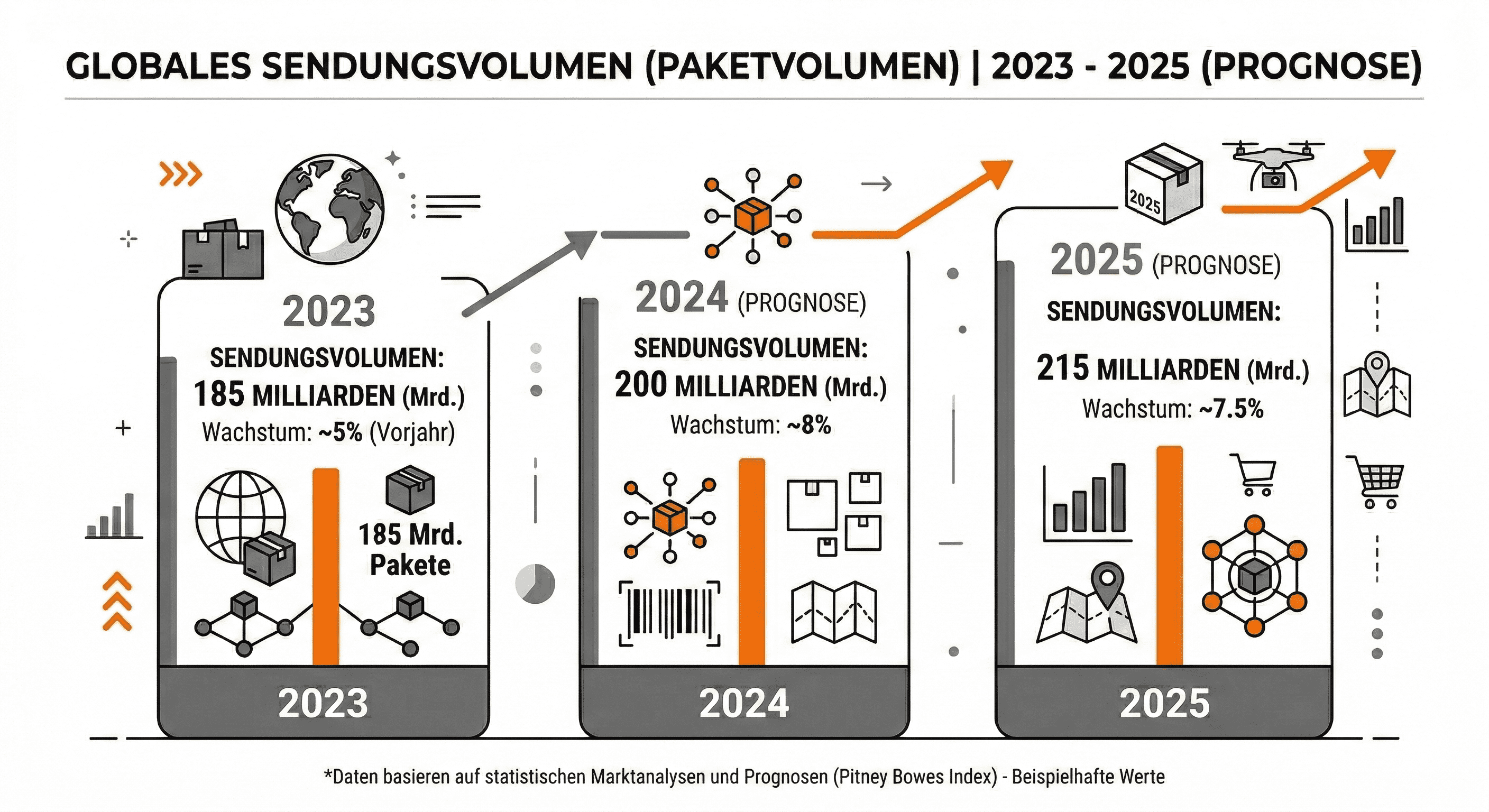 Die Daten für diese Grafik basieren auf dem jährlich erscheinenden Pitney Bowes Parcel Shipping Index. Dies ist einer der weltweit anerkanntesten Berichte für die Logistikbranche, der das Sendungsvolumen und die Ausgaben in 13 wichtigen Märkten (darunter China, USA, Deutschland und Japan) analysiert.